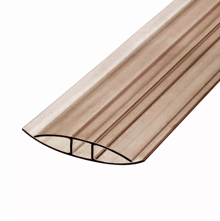 Поликарбонатные профили имеют Н-образное сечение это самое простое решение соединения панелей. Профили защищены от воздействия солнечной радиации с наружной стороны. Они могут быть изогнуты вместе с плитами до минимально допустимого радиуса изгиба плит.